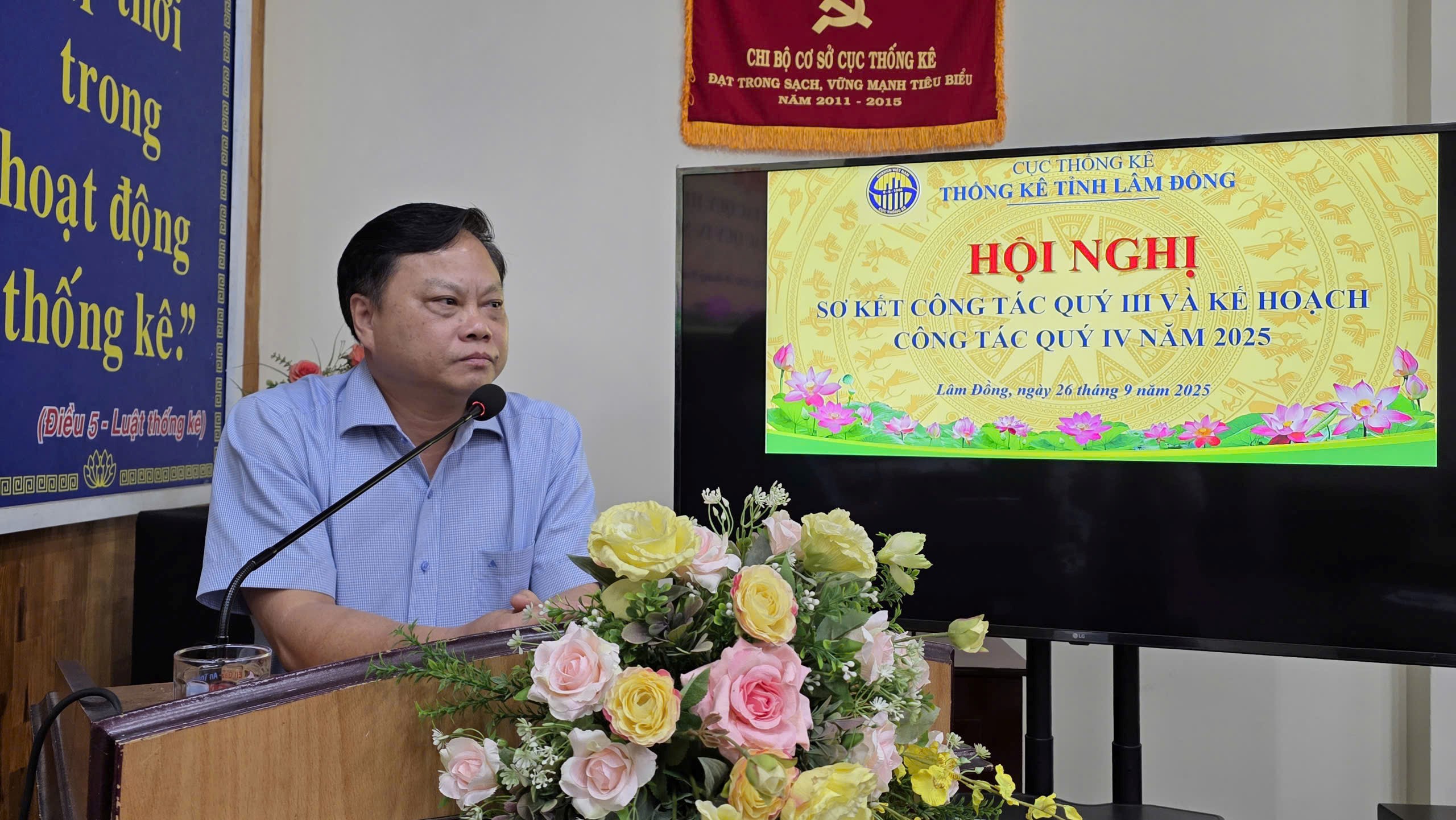 Sáng ngày 26/9/2025, Thống kê tỉnh Lâm Đồng đã tổ chức Hội nghị sơ kết công tác quý III và đề ra các nhiệm vụ trọng tâm cho quý IV năm 2025. Đồng chí Phạm Quốc Hùng, Bí thư Đảng ủy, Trưởng Thống kê tỉnh Lâm Đồng, chủ trì hội nghị.