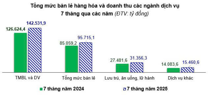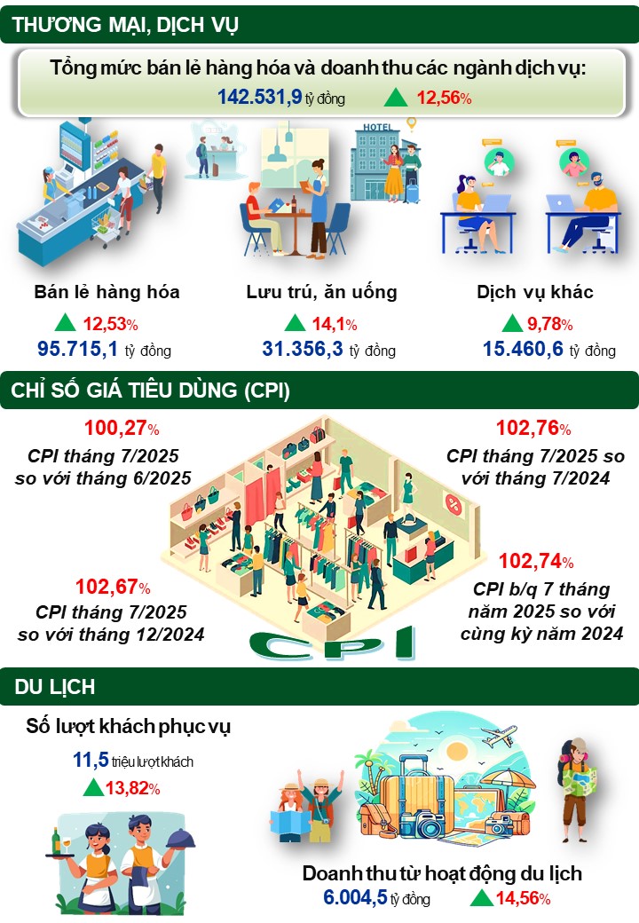 Lũy kế 7 tháng năm 2025, tổng mức bán lẻ hàng hóa và doanh thu các ngành dịch vụ ước đạt 142.531,9 tỷ đồng, tăng 12,56% so với cùng kỳ năm trước (nếu loại trừ yếu tố giá tăng 9,75%). Trong đó: tổng mức bán lẻ hàng hóa ước đạt 95.715,1 tỷ đồng, tăng 12,53% so với cùng kỳ năm trước; doanh thu lưu trú, ăn uống và lữ hành ước đạt 31.365,3 tỷ đồng, tăng 14,1% so với cùng kỳ năm trước; doanh thu các ngành dịch vụ khác ước đạt 15.460,5 tỷ đồng, tăng 9,78% so với cùng kỳ năm trước.