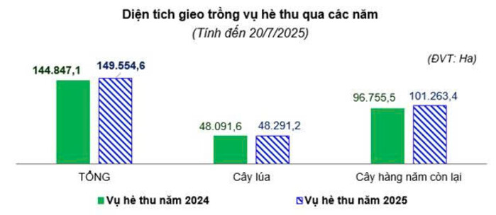 Tiến độ sản xuất vụ hè thu: Tính đến ngày 20/7/2025, toàn tỉnh đã tiến hành xuống giống gieo trồng vụ hè thu đạt 149.554,6 ha, tăng 3,25% so với cùng kỳ năm trước, trong đó: diện tích lúa vụ hè thu đạt 48.291,2 ha, tăng 0,42%; ngô đạt 31.772,9 ha, tăng 2,1%; khoai lang đạt 3.823,9 ha, tăng 0,2%; đậu các loại đạt 1.424,8 ha, tăng 0,15%; rau các loại đạt 30.638,9 ha, tăng 1,01%; hoa các loại đạt 3.389,2 ha, tăng 5,15% so với cùng kỳ năm trước.