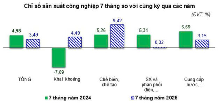 Chỉ số sản xuất toàn ngành công nghiệp (IIP) trong tháng ước tăng 1,68% so với tháng trước và tăng 11,73% so với cùng kỳ năm trước. Tính chung 7 tháng năm 2025, ước IIP tăng 3,49% so với cùng kỳ năm trước[1]. Trong đó, ngành công nghiệp khai khoáng tăng 4,49%; ngành công nghiệp chế biến chế tạo tăng 9,42%; ngành sản xuất và phân phối điện, khí đốt, nước nóng, hơi nước và điều hòa không khí tăng 0,32%; ngành cung cấp nước, hoạt động quản lý và xử lý rác thải, nước thải tăng 3,15%.