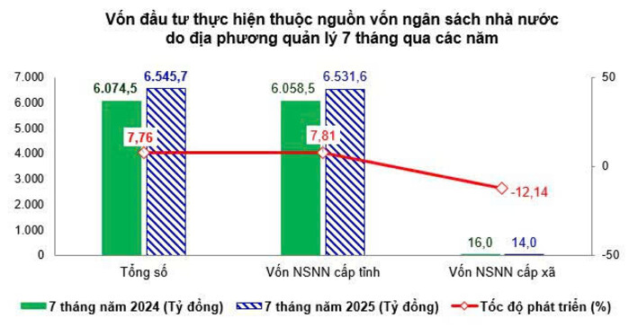 Tính chung 7 tháng năm 2025, vốn đầu tư thực hiện từ nguồn ngân sách nhà nước do địa phương quản lý ước 6.545,7 tỷ đồng, đạt 41,21% so với kế hoạch, tăng 7,76% so với cùng kỳ năm trước. Trong đó: vốn ngân sách nhà nước cấp tỉnh ước đạt 6.531,6 tỷ đồng, tăng 7,81%; vốn ngân sách nhà nước cấp xã ước đạt 14 tỷ đồng, giảm 12,14%.