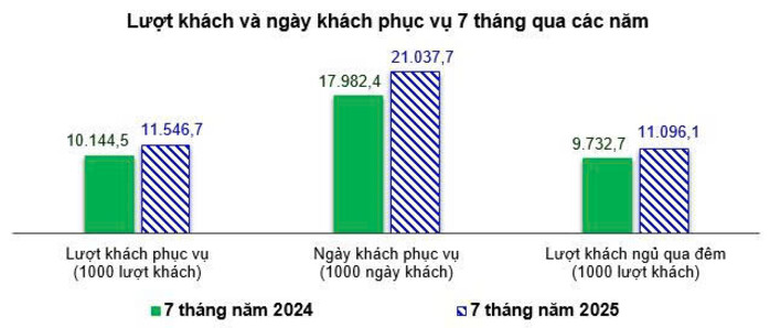 Lượt khách phục vụ trong tháng ước đạt 1.909,1 nghìn lượt, tăng 9,97% so tháng trước và tăng 13,52% so với cùng kỳ năm trước (trong đó lượt khách phục vụ trong ngày ước đạt 75,8 nghìn lượt khách, tăng 3,32% so với tháng trước và tăng 15% so với cùng kỳ năm trước); ngày khách phục vụ ước đạt 3.470 nghìn ngày khách, tăng 10,96% so với tháng trước và tăng 16,64% so với cùng kỳ năm trước. Lũy kế 7 tháng năm 2025 lượt khách ước đạt 11.546,7 nghìn lượt, tăng 13,82% so với cùng kỳ năm trước (trong đó lượt khách phục vụ trong ngày ước đạt 450,6 nghìn lượt khách, tăng 9,41% so với cùng kỳ năm trước); ngày khách phục vụ ước đạt 21.037,7 nghìn ngày khách, tăng 16,99% so với cùng kỳ năm trước.