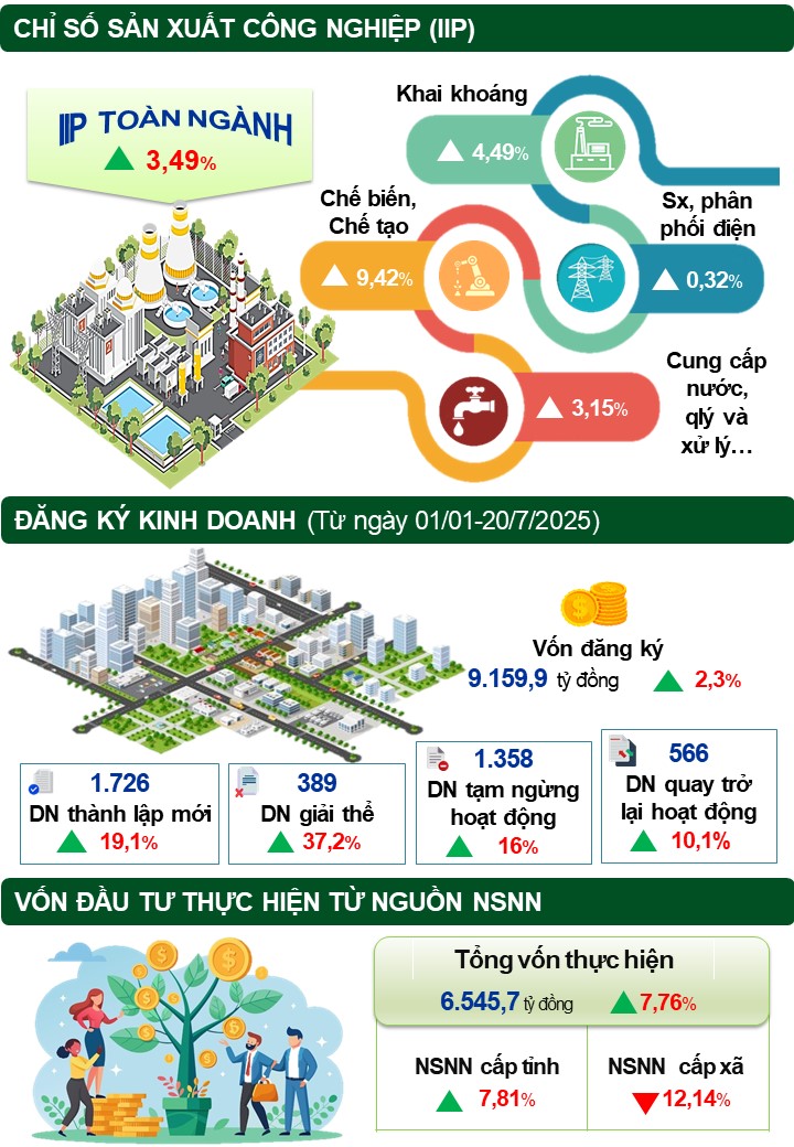 - Về phát triển doanh nghiệp: Trong tháng có 200 doanh nghiệp thành lập mới, với số vốn đăng ký 664,9 tỷ đồng, tăng 102% về số doanh nghiệp, tăng 120% về vốn đăng ký; 68 doanh nghiệp đăng ký tạm ngừng hoạt động, tăng 19,3%; 37 doanh nghiệp giải thể, tăng 105,6%; 48 doanh nghiệp hoạt động trở lại, tăng 65,5% so cùng kỳ. Lũy kế 7 tháng năm 2025, có 1.726 doanh nghiệp thành lập mới, với số vốn đăng ký 9.159,9 tỷ đồng, tăng 19,1% về số doanh nghiệp, tăng 2,3% về vốn đăng ký; 1.358 doanh nghiệp đăng ký tạm ngừng hoạt động, tăng 16%; 389 doanh nghiệp giải thể, tăng 37,2%; 566 doanh nghiệp hoạt động trở lại, tăng 10,1% so cùng kỳ.