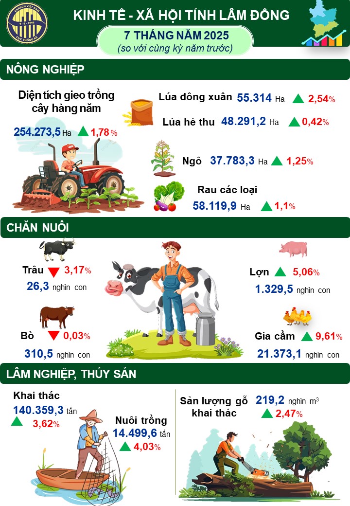 * Cây hàng năm: Trong tháng thời tiết mưa đều khắp các địa phương trong tỉnh, tạo độ ẩm cần thiết cho đất và thuận lợi cho công tác gieo trồng, cũng như tình hình sinh trưởng phát triển của cây trồng. Tổng diện tích gieo trồng ước 7 tháng năm 2025 đạt 254.273,5 ha; tăng 1,78% so với cùng kỳ năm trước. Trong đó: ngô đạt 37.783,3 ha, tăng 1,25%; rau các loại gieo trồng đạt 58.119,9 ha, tăng 1,1%; đậu các loại gieo trồng đạt 11.116,2 ha, tăng 3,59%; hoa các loại gieo trồng đạt 7.621,6 ha, tăng 4,86%.