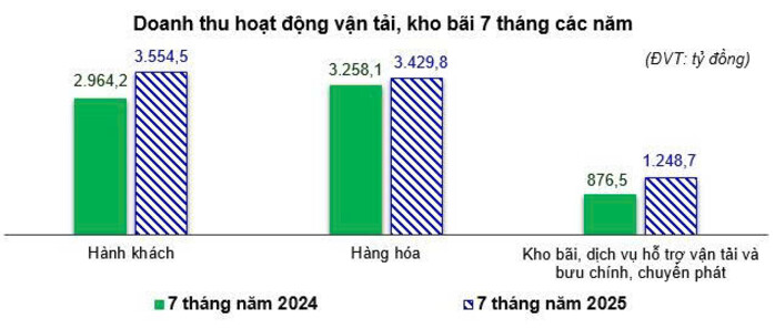 - Doanh thu hoạt động vận tải, kho bãi: Trong tháng ước đạt 1.279,5 tỷ đồng, tăng 4,44% so với tháng trước và tăng 19,84% so với cùng kỳ năm trước. Lũy kế 7 tháng năm 2025 ước đạt 8.233,1 tỷ đồng, tăng 15,98% so với cùng kỳ năm trước. Trong đó: doanh thu vận tải hành khách ước đạt 3.554,5 tỷ đồng, tăng 19,92% so với cùng kỳ năm trước; doanh thu vận tải hàng hóa ước đạt 3.429,8 tỷ đồng, tăng 5,27%; doanh thu kho bãi, dịch vụ hỗ trợ vận tải ước đạt 1.212 tỷ đồng, tăng 43,6%; doanh thu bưu chính, chuyển phát ước đạt 36,7 tỷ đồng, tăng 12,04%.
