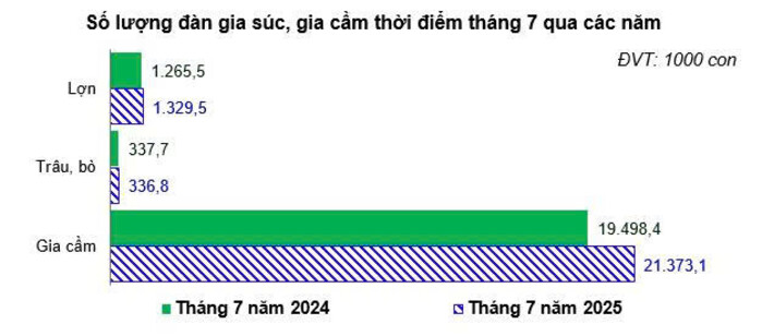 - Sản phẩm thức ăn cho gia súc: Ước trong tháng sản lượng đạt 21,9 nghìn tấn, tăng 3,24% so với tháng trước và tăng 16,95% so với cùng kỳ, lũy kế 7 tháng năm 2025 sản lượng đạt 145,9 nghìn tấn, tăng 10,25% so với cùng kỳ.